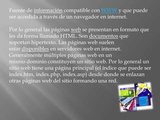 El documento describe las características de las páginas web. Explica que una página web generalmente se presenta en formato HTML y está disponible en un servidor web. Las páginas web pueden ser estáticas o dinámicas, y pueden crearse usando diferentes tecnologías como HTML, Flash o lenguajes de programación de servidor.