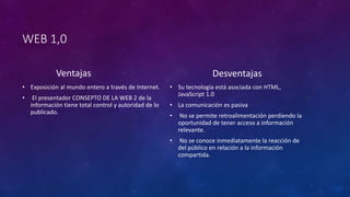 La Web 1.0 permitía una comunicación unidireccional donde las empresas publicaban información sobre sus productos y servicios. La Web 2.0 introdujo herramientas colaborativas que aprovecharon la inteligencia colectiva a través de plataformas en línea. La Web 3.0 busca integrar la información de forma inteligente a través de búsquedas personalizadas y la geolocalización de usuarios.