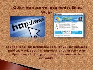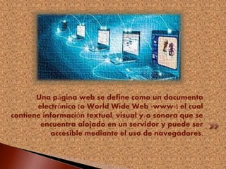 Una página web se define como un documento electrónico alojado en un servidor que contiene información textual, visual y/o sonora accesible mediante navegadores. Las páginas web incluyen elementos como texto, imágenes, audio, video e hipervínculos. Las páginas se clasifican en HTML, Flash o lenguaje de servidor, y pueden ser estáticas o dinámicas.