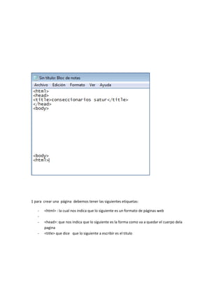 Para crear una página web básica se requieren las etiquetas <html>, <head> y <title> para indicar el formato, encabezado y título de la página. Luego se guarda el archivo con la extensión .html y se puede agregar texto que aparecerá al abrir la página en un navegador.