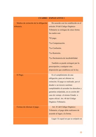 Este documento resume los principales aspectos del pago de obligaciones tributarias según el Código Orgánico Tributario de Venezuela. Explica que el pago extingue la obligación tributaria y puede realizarse en efectivo, por compensación u otras formas. También cubre temas como los plazos de pago, prórrogas, intereses moratorios y sanciones por incumplimiento.
