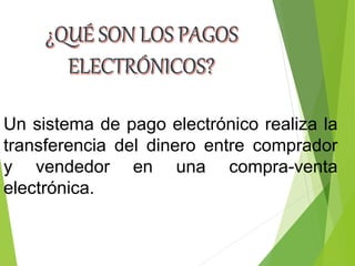 Un sistema de pago electrónico realiza la transferencia de dinero entre compradores y vendedores durante transacciones electrónicas a través de una entidad financiera autorizada, utilizando métodos como tarjetas de crédito, monederos electrónicos o banca electrónica.
