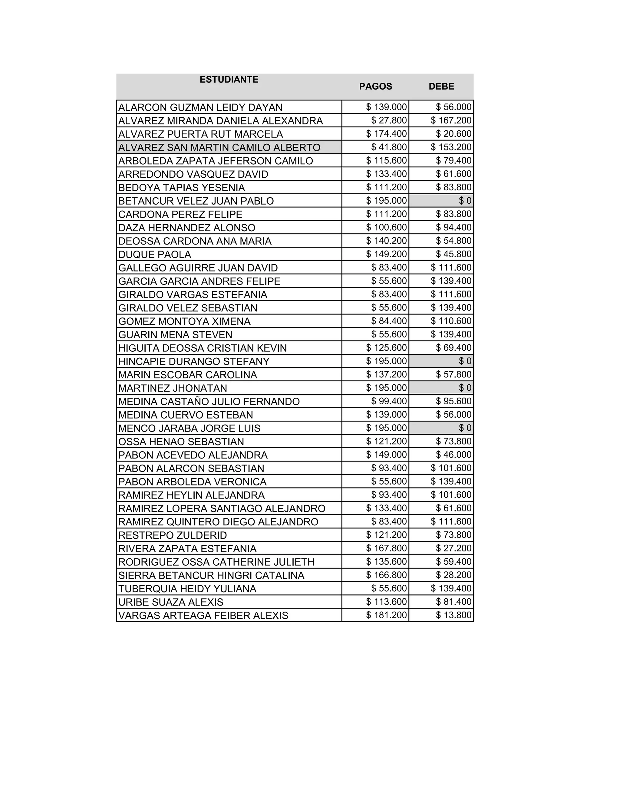 Este documento presenta una lista de estudiantes con la cantidad de dinero que cada uno ha pagado y adeuda por concepto de estudios. Se muestran los nombres de los estudiantes, el monto pagado y el saldo pendiente. Algunos estudiantes no tienen saldo adeudado.
