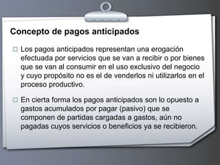 Este documento define los pagos anticipados como erogaciones efectuadas por servicios o bienes que se recibirán en el futuro para uso exclusivo del negocio. Proporciona ejemplos como rentas, impuestos, seguros e intereses pagados por adelantado. Explica que los pagos por bienes se reconocen como gasto o activo dependiendo si generarán beneficios futuros, y que los pagos por servicios se reconocen como gasto a medida que se reciben los servicios. Además, establece las reglas de valuación, presentación