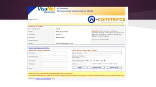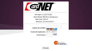 El documento describe varios métodos de pagos electrónicos como Cardnet, Visanet, PayPal y Authorize.net. Explica sus características principales como la facilidad de implementación, soporte para tarjetas locales y métodos de integración como pagos integrados y SOAP. También analiza ventajas como SDK para diferentes lenguajes y desventajas como interfaces poco personalizables y costos elevados para pequeñas empresas.