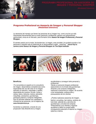 Este documento describe un programa intensivo de 6 días para convertirse en un experto en asesoría de imagen y personal shopper. El programa enseña sobre colorimetría, visagismo, tipología de cuerpos, estilos y tendencias, armado de guardarropas, compras inteligentes y desarrollo de un plan de negocio. El programa se dirige a personas interesadas en esta carrera profesional y a ejecutivos de áreas relacionadas con la moda y el marketing. Al completar el programa se obtiene una certificación profesional en ases
