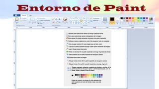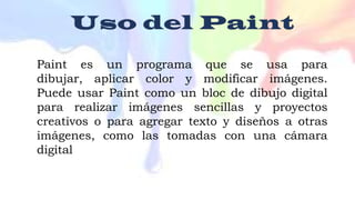 Paint es un programa que permite dibujar, colorear y modificar imágenes de forma digital. Se puede usar como bloc de dibujo para crear imágenes sencillas o agregar texto y diseños a fotos. Incluye herramientas para dibujar formas, líneas y agregar color que permiten realizar proyectos creativos de manera fácil.