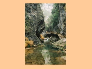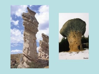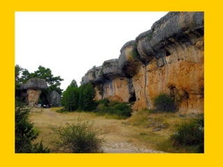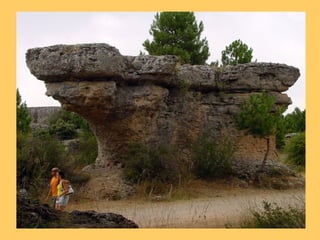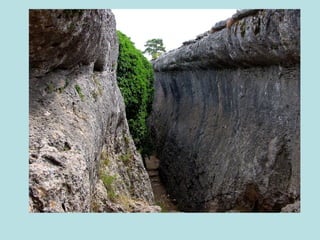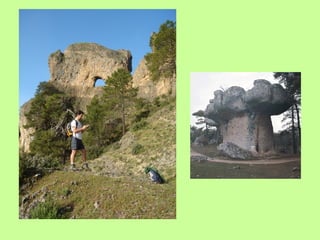 El documento describe diferentes características del paisaje cárstico formado sobre rocas calizas, incluyendo cañones, fuentes, plataformas cársicas, piscinas naturales, canchales, dolinas, uvalas y torcales. También menciona ejemplos concretos como el cañón del río Vero en Huesca, la foz de Lumbier en Navarra, la erosión diferencial en la peña Gorbea y la ciudad encantada de Cuenca.