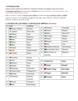 Este documento presenta información sobre los países de América, incluyendo una introducción que indica que hay 35 países divididos en cuatro regiones, un listado alfabético de cada país con su bandera y capital, y un mapa para ubicarlos geográficamente.