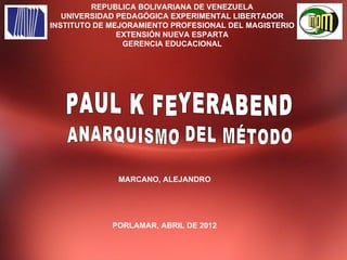 El documento presenta una biografía del filósofo de la ciencia Paul Feyerabend. Resume sus principales obras y puntos de vista filosóficos, incluyendo su crítica del método científico, su defensa de un "anarquismo epistemológico" y su visión de que no hay una única forma válida de generar conocimiento.