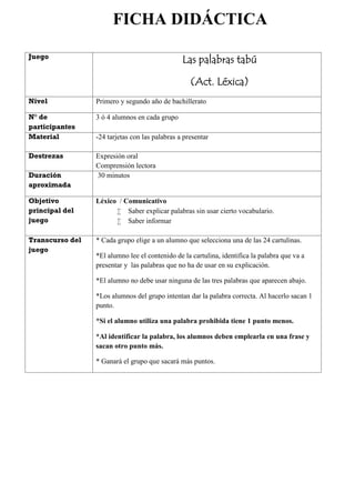 Este documento presenta un juego didáctico llamado "Las palabras tabú" destinado a estudiantes de primer y segundo año de bachillerato. El objetivo es mejorar la expresión oral y comprensión lectora al tener que explicar palabras sin usar ciertas palabras tabú. El juego se juega en grupos donde los estudiantes intentan adivinar palabras escogidas de tarjetas mientras el explicador no usa 3 palabras prohibidas en cada tarjeta.