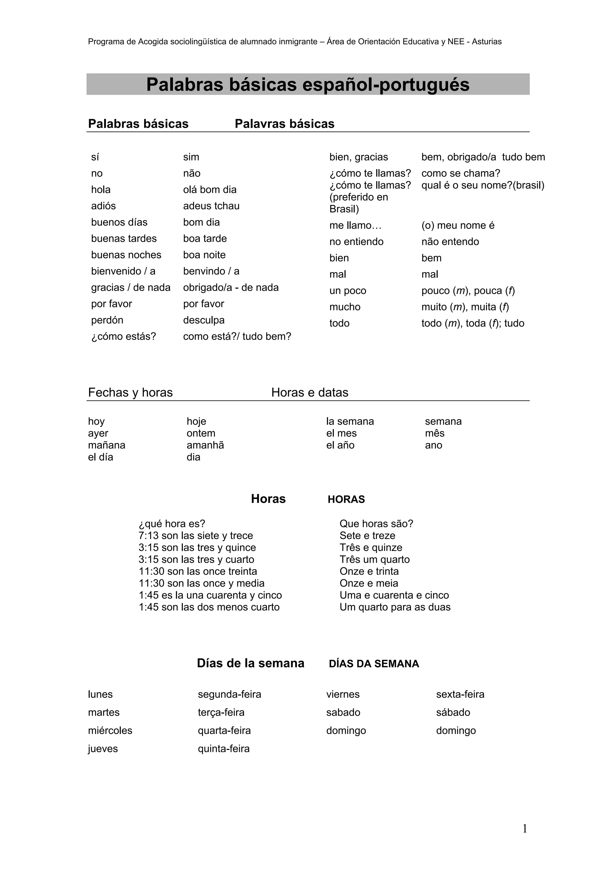 Este documento presenta una lista de palabras y frases básicas en español y portugués para facilitar la comunicación entre hablantes de los dos idiomas. Incluye términos relacionados con saludos, días, meses, números, partes del cuerpo y familias. El objetivo es ayudar a los estudiantes inmigrantes lusófonos a familiarizarse con el vocabulario elemental del español.