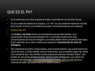 El documento proporciona información sobre conceptos clave relacionados con el pH como el significado de pH, la escala de pH, ácidos y bases fuertes y débiles, iones de hidrógeno e hidróxido, indicadores de pH y cómo medir el pH. También explica términos como acidez, basicidad, alimentos y nutrientes en relación con el pH.