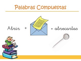 El documento presenta ejemplos de palabras compuestas adecuadas para el aprendizaje de lengua en primer grado. Incluye términos como 'abrecartas', 'baloncesto', y 'paraguas', entre otros. Se enfatiza la enseñanza de estas palabras en el contexto educativo de la escuela Madre del Divino Pastor en Cieza, Murcia.