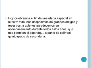 La autora agradece a sus maestros y amigos por acompañarla durante sus años de primaria, recordando con cariño cómo ingresó nerviosa al colegio y cómo cada maestro contribuyó a su educación de manera única. También agradece a sus padres por elegir ese colegio y apoyarla, permitiéndole alcanzar sus metas, y a sus compañeras por compartir tantos recuerdos a lo largo de esos 11 años.