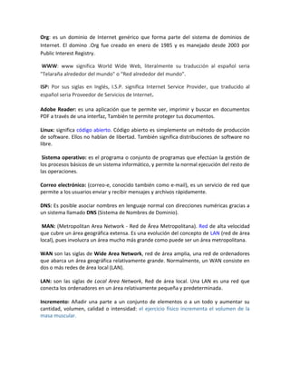 El documento define y explica varios términos relacionados con la tecnología de la información y la comunicación. Define palabras como página web, sitio web, URL, chat, PDF, FTP, redes sociales, navegador, correo electrónico, DNS, LAN, WAN, servidor, foros, hipermedia, enlace, hipervínculo, buscador, modem, Facebook, menú, usuario, blog y virus.