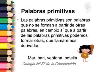 El documento explica la diferencia entre palabras primitivas y derivadas. Las palabras primitivas no se forman a partir de otras palabras, mientras que las palabras derivadas sí se forman a partir de palabras primitivas mediante la adición de prefijos o sufijos. Proporciona ejemplos de ambos tipos de palabras y explica que los morfemas derivativos, como prefijos y sufijos, modifican el significado de las palabras primitivas al añadirse.