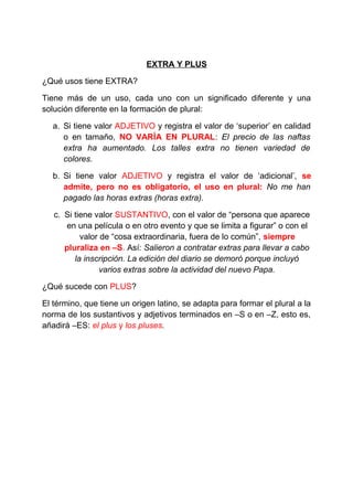 Este documento explica las reglas para formar el plural de construcciones léxicas compuestas por dos sustantivos. Indica que el segundo sustantivo puede pluralizarse o no, dependiendo de si puede funcionar como atributo del primero en una oración copulativa (e.g. "horas clave" puede ser "horas claves"). También analiza los usos y formación de plural de las palabras "extra" y "plus", señalando que "extra" no varía en plural cuando es adjetivo con valor de "superior", pero sí puede pluralizarse cuando es sustantivo.