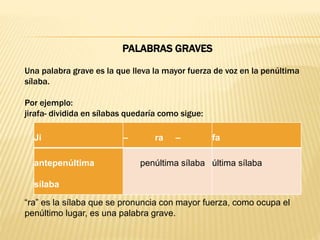 Este documento explica las palabras graves, que son aquellas donde la penúltima sílaba recibe el mayor énfasis al pronunciarla. Proporciona ejemplos como "jirafa", "plancha" y "locomotora". También indica que las palabras graves llevan tilde ortográfica cuando no terminan en vocal o en las consonantes n o s, como en "árbol", "lápiz" y "agonía".