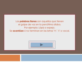 Este documento presenta una revisión de ortografía sobre palabras llanas en español. Explica que las palabras llanas tienen el acento tónico en la penúltima sílaba y se acentúan si no terminan en "n", "s" o vocal. Luego, contiene ejercicios de selección sobre cuáles palabras de pares dados deben llevar tilde de acuerdo a esta regla.