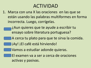El documento presenta algunas palabras multiformes como "acerca", "aún", "adonde" y explica su uso correcto en oraciones. Propone actividades como marcar oraciones con uso incorrecto de estas palabras y corregirlas, escribir oraciones con cada palabra y completar oraciones con la palabra adecuada.