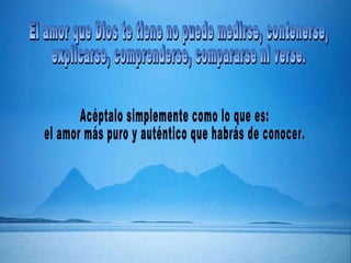 Este documento contiene varios pasajes breves que hablan sobre la paz, tranquilidad y amor de Dios. Algunos pasajes describen cómo Dios puede salvarnos de cualquier problema, cómo la oración nos lleva a una dimensión espiritual libre, y cómo debemos encontrar la paz interior en Dios a pesar del caos externo. Otros enfatizan que nada ocurre por casualidad sino de acuerdo al plan de Dios, y que no debemos preocuparnos ya que nuestro futuro está seguro en Sus manos.