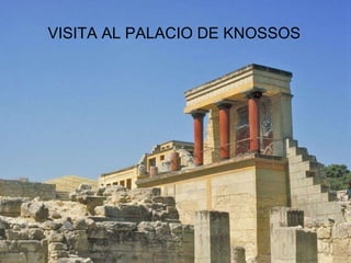 El documento resume la visita al Palacio de Knossos en Creta, la civilización minoica que se desarrolló allí, y los detalles arquitectónicos descubiertos por el arqueólogo Sir Arthur Evans a comienzos del siglo XX. Explica la leyenda del Minotauro, el descubridor del palacio, y guía al lector a través de las diferentes salas y características reconstruidas, incluyendo el salón del trono, los baños, almacenes y frescos.