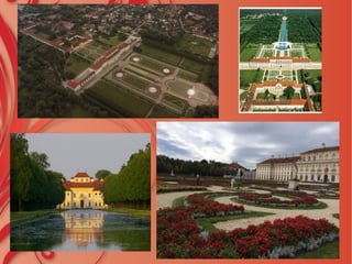 El documento proporciona información sobre varios palacios en Alemania. Brevemente describe la ubicación, historia y estilo arquitectónico de los palacios de Wurzburgo, Schleissheim, Sanssouci, Linderhof y Nymphenburg. Todos los palacios datan de entre los siglos XVII y XIX y muestran estilos como el barroco y el rococó. Fueron residencias de la nobleza y la realeza alemanas.