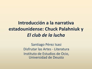 Este documento presenta un resumen de la narrativa estadounidense del siglo XX y principios del siglo XXI, mencionando autores representativos de diferentes generaciones y corrientes literarias como la Generación Perdida, la Generación Beat, el Realismo Sucio y la literatura posmoderna. Luego se centra en Chuck Palahniuk y su novela más famosa El club de la lucha, caracterizándola como una obra de ficción transgresiva que critica el consumismo a través de la violencia y el humor negro.