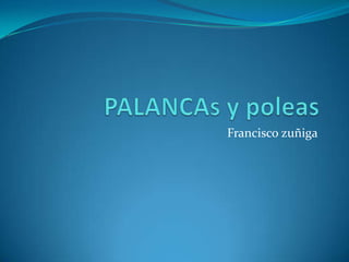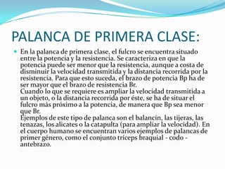 Este documento describe las tres clases de palancas y sus características. La palanca de primera clase tiene el fulcro entre la potencia y la resistencia, la de segunda clase tiene la resistencia entre la potencia y el fulcro, y la de tercera clase tiene la potencia entre la resistencia y el fulcro. También proporciona ejemplos de cada clase y explica cómo las poleas pueden usarse para aumentar la ventaja mecánica.