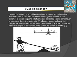 La palanca es una máquina simple que permite mover cargas grandes aplicando una fuerza pequeña. Tiene tres partes: punto de apoyo, brazo de potencia y brazo de resistencia. Los egipcios, griegos y Arquímedes descubrieron y perfeccionaron su uso para construir edificios y mover objetos pesados con poco esfuerzo. Existen tres tipos de palancas según la posición del punto de apoyo y los brazos.