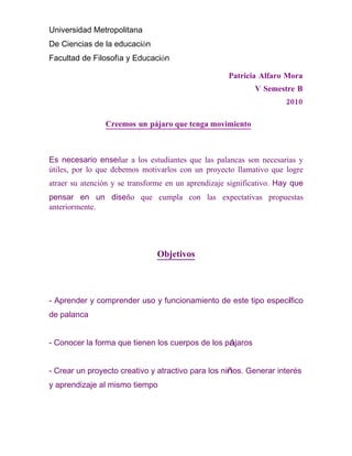 Este documento presenta un proyecto para crear un pájaro móvil utilizando palancas para enseñar este concepto a estudiantes de manera atractiva. El proyecto tiene como objetivos que los estudiantes aprendan sobre el uso y funcionamiento de las palancas, conozcan la forma de los pájaros y creen un proyecto creativo. Se detallan los pasos y materiales necesarios para construir la estructura del pájaro dentro de un vaso utilizando alambre, de modo que se mueva cuando se manipula la palanca
