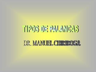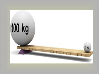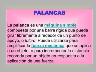 La palanca es una máquina simple compuesta por una barra rígida que gira alrededor de un punto de apoyo o fulcro. Se utiliza para amplificar fuerzas o incrementar distancias de movimiento. Existen tres tipos de palancas dependiendo de la posición del fulcro y las fuerzas de potencia y resistencia. El principio de la palanca establece que la relación entre los brazos de palanca y las fuerzas determina el equilibrio.