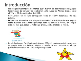 En los Juegos Paralímpicos de Atenas 2004 participaron 3.806 atletas de 140 países. España obtuvo 71 medallas, siendo su mejor actuación la natación con 40 medallas, destacando las actuaciones de Sebastián Rodríguez, Sara Carracelas y Teresa Perales. La boccia también tuvo un buen resultado para España con medallas de oro, plata y bronce.