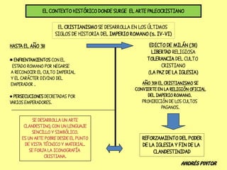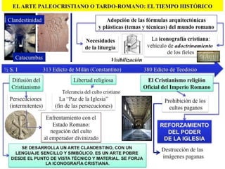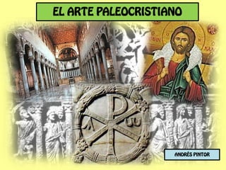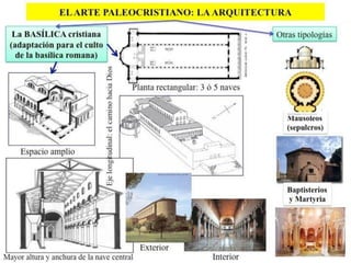 El documento describe la arquitectura y el arte paleocristiano, incluyendo las basílicas, catacumbas, mausoleos y símbolos cristianos primitivos como El Buen Pastor. Se analizan ejemplos arquitectónicos como la Basílica de Santa Sabina y San Juan de Letrán en Roma, así como sarcófagos paleocristianos con escenas bíblicas.