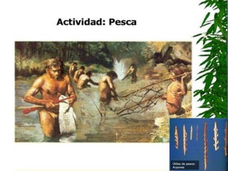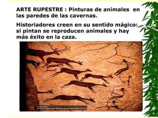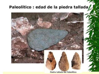 El documento describe cómo era la vida durante el Paleolítico, el 99% del tiempo de la existencia humana en la Tierra. Los humanos del Paleolítico vivían como cazadores-recolectores nómadas, usando herramientas de piedra, hueso y madera. No entendían fenómenos naturales como tormentas y dependían de la magia y la religión.