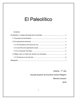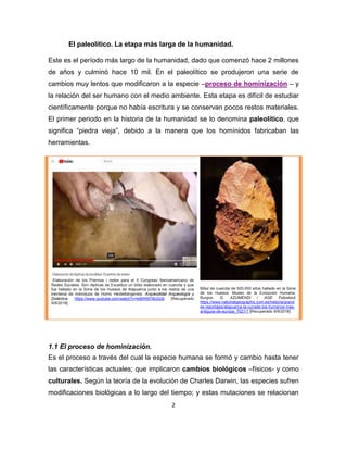 El documento resume la etapa del Paleolítico, el período más largo de la historia de la humanidad que comenzó hace 2 millones de años y finalizó hace 10 mil años. Durante este período, los primeros seres humanos dependían de la caza y recolección para alimentarse y vivían en grupos nómadas pequeños. Con el tiempo, desarrollaron habilidades como la fabricación de herramientas de piedra, el uso del fuego y las primeras formas de arte y espiritualidad.