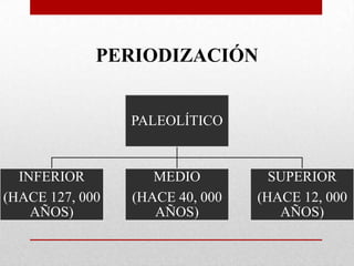 El documento resume la periodización del Paleolítico (hace 127,000 a 12,000 años) en tres períodos: Inferior, Medio y Superior. En el Paleolítico Inferior, los primeros humanos vivían de forma nómada, cazando y recolectando, y comenzaron a utilizar herramientas de piedra y el fuego. En el Paleolítico Medio dominaron el fuego, cazaron grandes mamíferos y tuvieron sociedades más numerosas. En el Paleolítico Superior dominaron completamente el uso de la