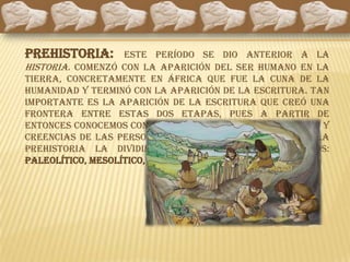 El documento proporciona información sobre el período prehistórico conocido como Paleolítico, que abarca desde hace 2 millones de años hasta hace 10.000 años. En este período, los primeros humanos vivían de forma nómada, cazando y recolectando. Se desarrollaron las primeras representaciones artísticas, como estatuillas y pinturas rupestres de animales. Algunas de las obras más conocidas son las "venus" que simbolizaban la fertilidad, así como las pinturas de las cuevas de Altamira.