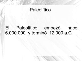 El documento describe la Edad de Piedra, también conocida como Paleolítico, que abarcó desde hace 6 millones de años hasta hace 12,000 años. Durante este período, los primeros humanos vivían en cuevas, cazaban y recolectaban frutos para alimentarse, y utilizaban herramientas de piedra, huesos y palos. Pintaban en las paredes de las cuevas escenas de caza con la creencia de que esto les daría suerte, y enterraban a sus muertos con objetos personales creyendo en la vida después de la