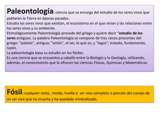 La paleontología estudia los seres vivos del pasado a través del análisis de sus fósiles. Los fósiles son cualquier resto mineralizado de un organismo prehistórico, como huesos, conchas o huellas. Para fosilizarse, los restos deben quedar enterrados rápidamente y reemplazarse sus componentes orgánicos por minerales como el carbonato cálcico.