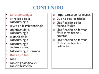 Este documento presenta una introducción a la paleontología. Explica que la paleontología estudia los fósiles para reconstruir organismos del pasado, sus relaciones con el medio ambiente y su evolución. También describe los principios y leyes de la paleontología, sus objetivos y una breve historia de la disciplina desde la antigüedad hasta el siglo XIX cuando se estableció como ciencia.