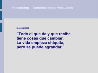 Este documento habla sobre la importancia de crear redes de contactos (networking) a través del intercambio y la hospitalidad. Explica que tanto el dar como el recibir son parte fundamental del proceso, y que es importante estar abierto a críticas y al rechazo sin frustrarse. También enfatiza la necesidad de superar barreras personales para establecer vínculos fructíferos que generen crecimiento mutuo.