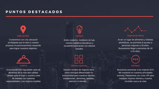 Este documento describe un proyecto para abrir un exclusivo club nocturno con alimentos y bebidas de lujo. El local tendrá una ubicación privilegiada y contará con un estilo moderno y mobiliario llamativo. Apuntará a clientes de 18 a 25 años y ofrecerá una carta de alimentos y bebidas de alta calidad, así como eventos con DJs y un área VIP. Su principal diferenciador será la exclusividad en las instalaciones y servicios. Se requieren $2,400,000 de inversión con un retorno esperado