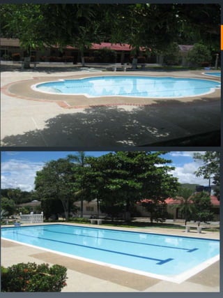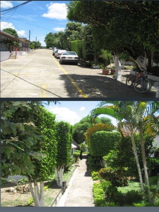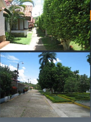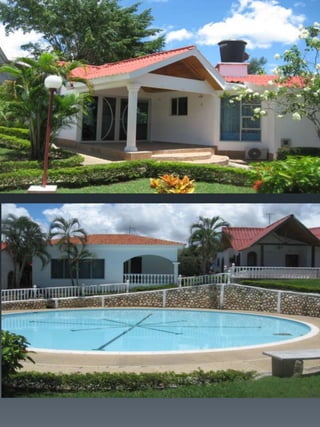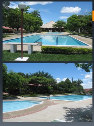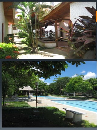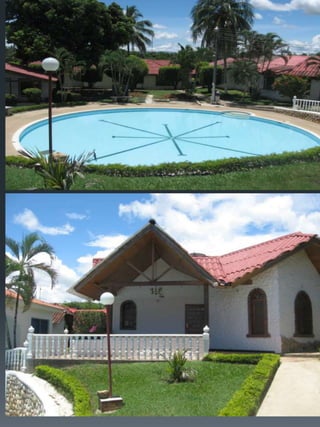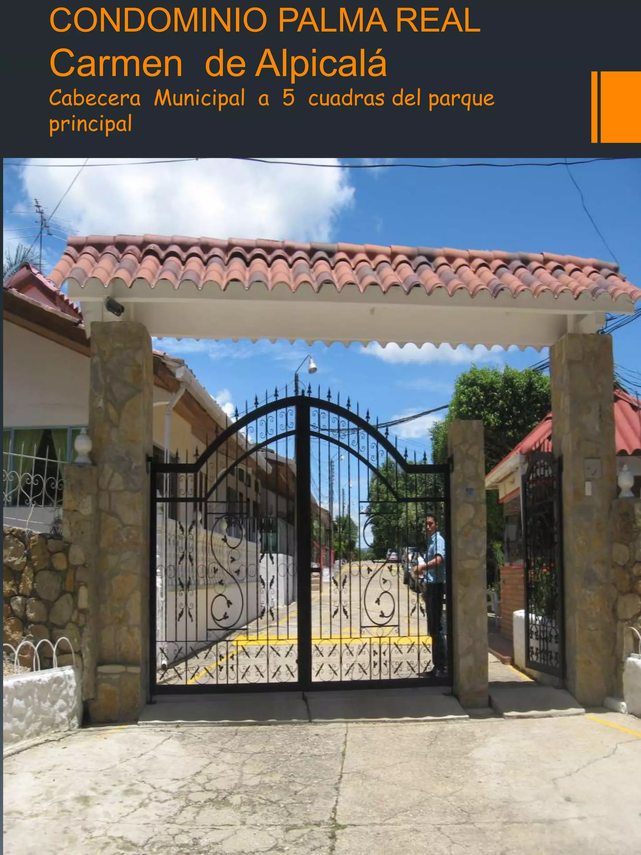 Este documento describe un condominio llamado Palma Real ubicado en Carmen de Alpicalá, a 5 cuadras del parque principal de la cabecera municipal. El condominio cuenta con 70 casas, 4 piscinas grandes, zonas sociales como restaurante, bar y salón de juegos, así como un miniestadio y parqueadero. Detalla los costos de administración, servicios y impuestos, y provee imágenes de las características de una de las casas como habitaciones, patio y áreas comunes.