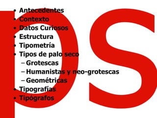 Este documento resume los antecedentes, contexto y tipos de las fuentes tipográficas palo seco. Explica que surgieron en el siglo XIX como subproducto de la civilización griega y que se caracterizan por no tener serifas. Describe las principales categorías de palo seco (grotescas, humanistas, geométricas) y algunas fuentes representativas como Futura, Gill Sans, Helvética y Univers. También resume los aportes de destacados tipógrafos como Morris Benton, Paul Renner, Eric Gill, Max Miedinger y Hermann
