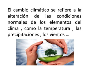 El documento describe el cambio climático como la alteración de las condiciones normales del clima como la temperatura y las precipitaciones, provocado por factores naturales y humanos como la tala de bosques. Esto produce gases de efecto invernadero y efectos variados como sequías, inundaciones y derretimiento del hielo de los polos. En 1997, representantes de países industrializados acordaron en Kioto reducir emisiones de gases de efecto invernadero y aumentar energías renovables para evitar consecuencias del cambio climático.