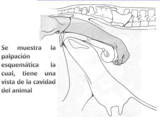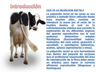 El documento describe una experiencia práctica en la palpación rectal de una vaca primeriza Jersey, destacando la habilidad para localizar el cérvix y los cuernos uterinos. Se concluye que la palpación es una herramienta valiosa para el manejo reproductivo y que su aplicación efectiva puede proporcionar información útil al ganadero más allá de la simple verificación de la gestación. Se enfatiza la necesidad de dedicación y práctica en este procedimiento para mejorar la eficiencia profesional y contribuir a la producción del rancho.