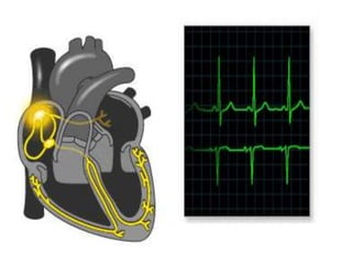 El documento proporciona información sobre palpitaciones y arritmias cardíacas. Describe los diferentes tipos de palpitaciones según su ritmo, frecuencia, periodicidad y relación entre el comienzo y el fin. También explica conceptos como taquicardia, bradicardia y fibrilación auricular.