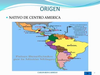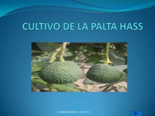 El documento trata sobre el cultivo del palto. Describe que el palto es nativo de Centroamérica y pertenece a la familia Lauraceae. Explica que existen tres razas principales de palta y que la variedad Hass se originó en California. Resalta la importancia de consideraciones como el suelo franco arenoso y profundo, así como el clima adecuado, para el cultivo exitoso del palto.